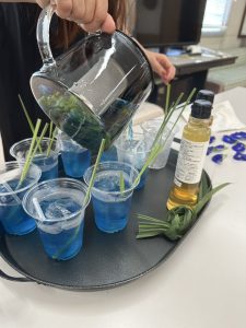 最後に柴田先生が、心遣いの込もったハーブティーでもてなしてくださいました。バタフライピーという鮮やかな青い花とレモングラスで淹れていただいたお茶は、アイスかホットかを選ばせてくださり、どちらにも対応できるよう氷まで準備してくださっていました。そんな細やかな心配りに感動しつつ、私たちはひんやりと爽やかなアイスティーを味わいました。
