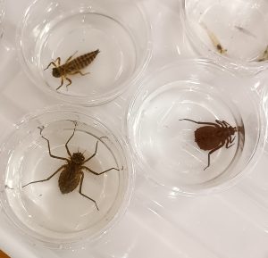 捕まえた水生生物:カワムツ、スミウキゴリ、ドジョウ、モクズガニ、カワニナ、ヌマエビ、スジエビ、ヘビトンボ、シロタニガワカゲロウ、コカゲロウ、オニヤンマ、コオニヤンマ、コヤマトンボ、コシボソヤンマ、オナガサナエ、ハグロトンボ、ヨコエビ等